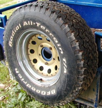 Montata nella misura 32x11,5x15 (anche se sulla gomma c'è scritto 855R15), su cerchi in acciaio Smiths scampanati. Si tratta di una gomma ricoperta ricavata da carcasse Michelin (così mi hanno detto...) con la classica scolpitura tipo Mud Terrain BFG. Si comporta bene su asfalto, anche se risulta essere rumorosissima (l'ullulato del copertone si sente da lontano). Scarica ottimamente l'acqua grazie al battistrada molto pronunciato, anche se risente delle pozzanghere a causa della misura. La durata non è al livello delle BFG anche se non ho avuto la possibilità di provare questa affermazione.